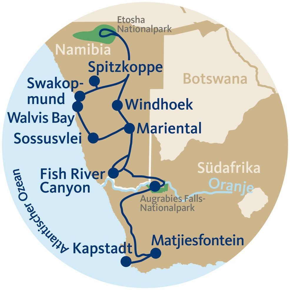 Von Windhoek reisen Sie mit dem African Explorer auf über 4.800 km per Zug und Bus zu den Naturwundern Namibias bis nach Kapstadt. Entdecken Sie die Naturwunder Namibias, die älteste Wüste der Welt mit den höchsten Dünen der Welt. Aber alleine die Fahrt durch Afrikas wechselhafte Landschaften, unberührte Gebiete und der Kontakt zur afrikanischen Kultur und den Menschen macht diese Reise zu einem unbeschreiblichen Erlebnis. Werden Sie auch Zeuge deutscher Kolonialgeschichte in Swakopmund und Windhoek erleben Sie deutsches Flair in Afrika.