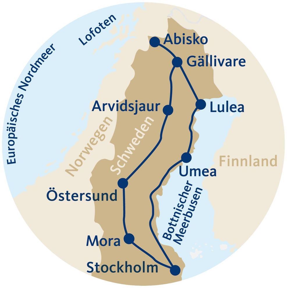Ihre Schweden-Reise startet in der Hauptstadt Stockholm. Ab hier fahren Sie nach Östersund und weiter mit der schwedischen Inlandsbahn nach Lappland, dem Land der Mitternachtssonne. In gemächlichem Tempo geht es durch idyllische Natur mit unberührten Wäldern und glasklaren Seen bis nach Gällivare. Mit der Ofotbahn reisen Sie anschließend bis zum Nationalpark Abisko und zurück über die landschatlich reizvollen nordschwedischen Orte Luleå und Umeå nach Stockholm.