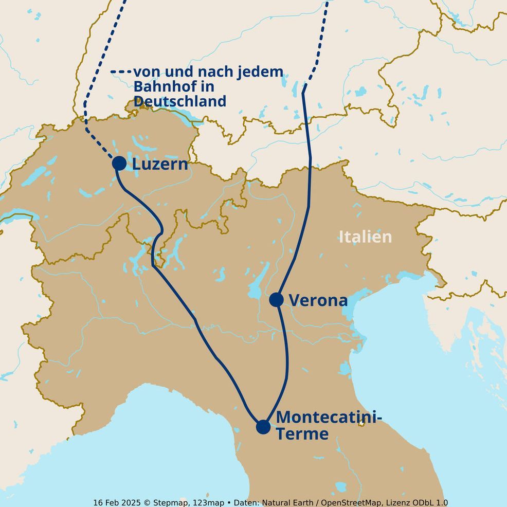 - Bahnfahrt 1. Klasse ab/bis jedem deutschen Bahnhof (und Österreich) via Luzern und zurück von Montecatini Terme via Stresa