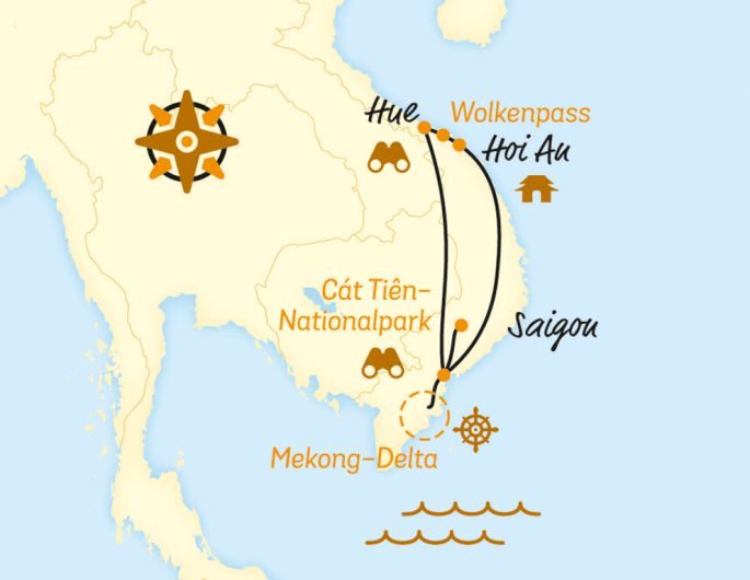 Lernen Sie ein faszinierendes, fernes Land mit all seinen Menschen, Landschaften, Köstlichkeiten und Geschichten aus den unterschiedlichsten Perspektiven kennen: Mit dem E-Bike auf dem Wolkenpass können Sie atemberaubende Aussichten auf Berge und Meer genießen, auf der Rikscha-Fahrt durch Chinatown das bunte Treiben Saigons auf sich wirken lassen, zu Fuß durch archaisch schöne Tempelanlagen schlendern und zum krönenden Abschluss per Schiff auf dem majestätischen Mekong der Sonne entgegengleiten. Auch kulinarisch geht Ihr Gaumen auf Reisen: bei hausgemachten regionalen Köstlichkeiten, Picknicks unter freiem Himmel und Verkostungen exotischer Früchte. Während Sie tagsüber Land und Leute hautnah erleben, können Sie abends in wunderschönen Resorts entspannen und die Erlebnisse dieser spektakulären Reise Revue passieren lassen.