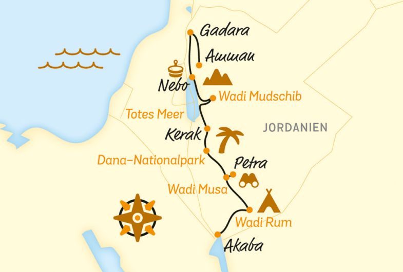 Willkommen im Königreich Jordanien! Mit Ihrer Belvelo-Reiseleitung entdecken Sie märchenhafte Wüstenlandschaften, antike Weltwunder wie die rosarote Felsenstadt Petra und beeindruckende Kreuzritter-Burgen. Wie einst Moses werfen Sie vom Berg Nebo einen Blick in das Gelobte Land … Freuen Sie sich auf Übernachtungen direkt am Toten Meer, im grünen Ajloun-Nationalpark und im artenreichen Dana-Nationalpark. Zwischen Ihren RadEtappen können Sie wunderbar entspannen: Erleben Sie den Sonnenuntergang in der Wüste, schmausen Sie gemeinsam mit Beduinen im Wadi Rum und relaxen Sie am Roten Meer!