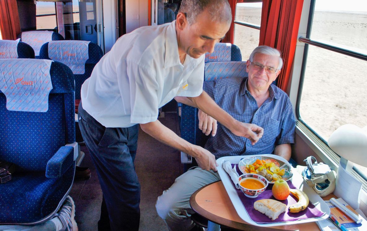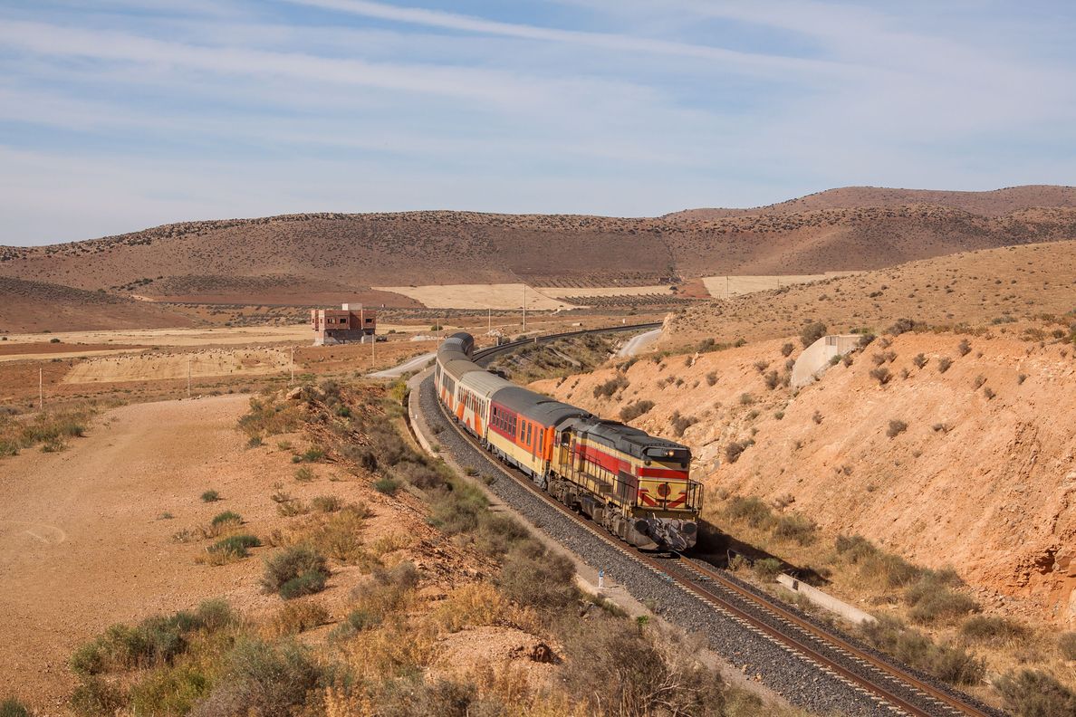 Der „Wüsten-Express“, auch „Oriental Desert Express“ genannt, fährt auf einer 300 km langen, kurvenreichen Strecke, die schon dem James-Bond-Film „Spectre“ als Kulisse diente, durch den entlegenen Osten Marokkos immer in Richtung Süden. Im mit großen Fenstern ausgestatteten klimatisierten 1. Klasse-Wagens wird ein Mittagesimbiss serviert. Separater Fotowagen mit zu öffnenden Fenstern.
