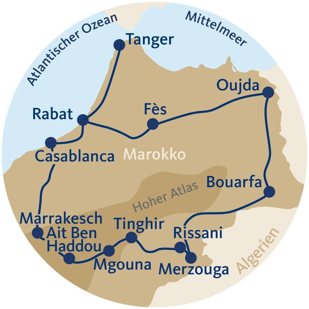 Mit den sehr komfortablen Linien- und Hochgeschwindigkeitszügen und dem legendären Sonderzug "Wüsten-Express" reisen Sie durch die eindrucksvollen Landschaften und in die entlegendsten Gebiete im Nordwesten Afrikas. Die traumhaften Königsstädte Rabat, Meknes, Fes und Marrakesch empfangen Sie mit quirligem Leben auf ihren bunten Märkten, wunderschönen Lehmhäusern und Palästen wie aus einem Märchen aus 1001 Nacht. Ausflüge in Allrad-Jeeps führen Sie auf Safari zu den Beduinen in die Einsamkeit der marokkanischen Wüste. Saftig-grüne, palmengesäumte Oasen laden zum Verweilen ein, und Sie erleben hautnah und mit vielfältigen Eindrücken die herrlichen Landschaften Marokkos: mit grün bewachsenen Bergen, tiefen Schluchten, abgelegenen Tälern, fruchtbaren Ebenen, kargen Steppen und bizarren Sandwüsten sowie einem imposantem Hochgebirgsmassiv. Steigen Sie ein und lassen Sie sich von den unterschiedlichen Kulturen und der Gastfreundschaft der Bewohner Marokkos begeistern!