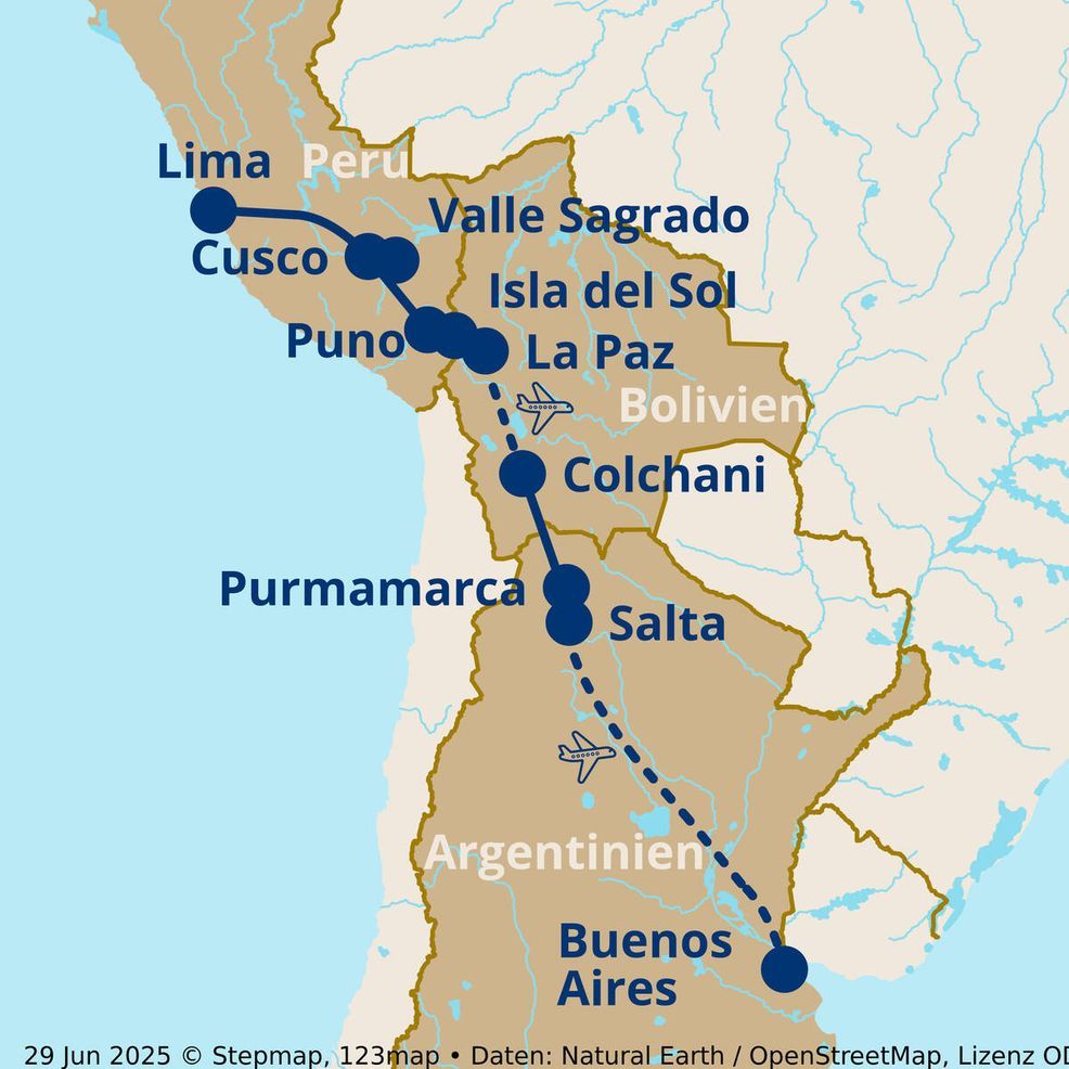 - Innersüdamerikanische Flüge Buenos Aires–Salta, Uquni–La Paz u. Cusco–Lima (Economy Class)