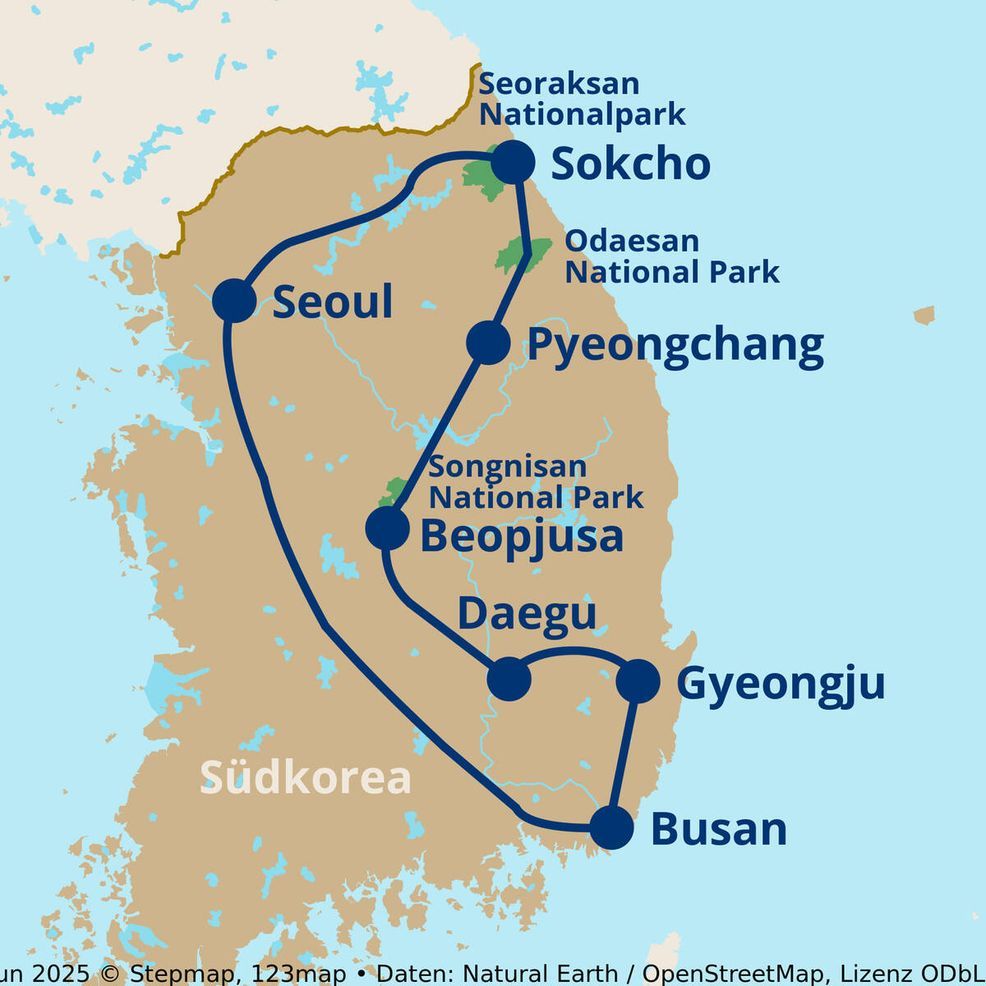 Bevor Sie am Morgen zum Odaesan-Nationalpark aufbrechen, tauchen Sie in das bunte Markttreiben des Jungang-Marktes ein. Hier erwarten Sie regionale Spezialitäten und das beliebte „Manseok“ – knusprig frittiertes Huhn in süßlicher Sauce, das bei keinem Besuch in Sokcho fehlen darf. Im Odaesan-Nationalpark erkunden Sie anschließend das idyllische Sogeumgang-Tal mit seiner beeindruckenden Naturkulisse. Mit etwas Glück entdecken Sie eine der über 30 heimischen Tierarten, die fast ausschließlich in diesem Schutzgebiet vorkommen. Am späten Nachmittag führt die Fahrt weiter in die frühere Olympia-Stadt Pyeongchang, wo Sie im Hotel übernachten. (Fahrzeit ca. 1,5 Std., 100 km, Gehzeit ca. 3 Std., 180 m, 6 km).