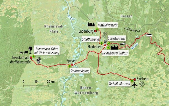 31.12.2025: Nach dem gemeinsamen Frühstück nehmen Sie zusammen mit Ihrer Reisegruppe an einer Stadtführung in Heidelberg teil. Die Altstadtführung wurde sogar mit dem Titel "Best Class Badge" ausgezeichnet. Während des Rundgangs wird Ihnen die Geschichte, aber auch das moderne Leben der Stadt näher gebracht. Sie laufen durch die verwinkelten Gassen vorbei an der ältesten Universität Deutschlands, dem "Hotel zum Ritter", dem ältesten noch erhaltenen Haus Heidelbergs, der Heiliggeistkirche, dem Jesuitenviertel und der Alten Brücke. Freuen Sie sich außerdem auf eine Auffahrt mit der im Jahr 1890 erbauten Bergbahn zum Heidelberger Schloss. Ihnen öffnet sich ein wunderbarer Blick über die Stadt sowie das Neckartal. Ihre Stadtführerin zeigt Ihnen außerdem den Schlossgarten, den Innenhof sowie das berühmte Große Fass der kurfürstlichen Ruine.