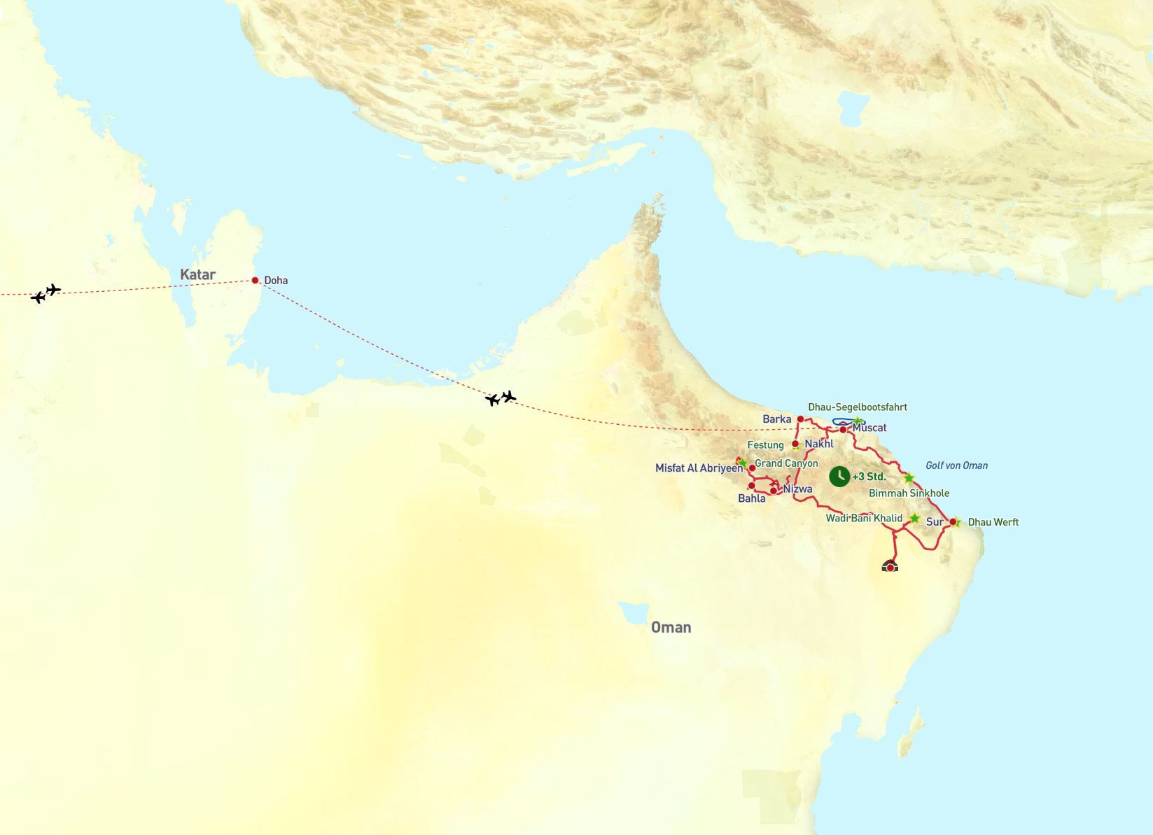 - Flüge mit Qatar Airways ab/an Berlin, München, Frankfurt/Main, Wien oder Zürich mit Umstieg in Doha nach/von Muscat