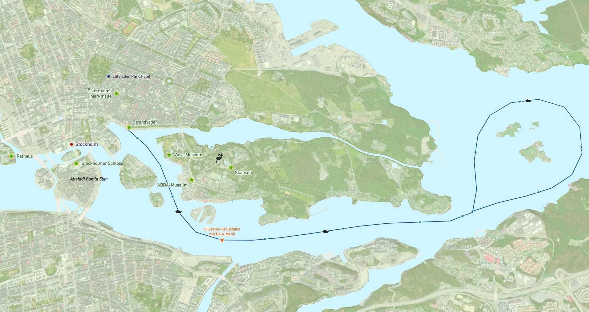 Den Silvesterabend verbringen Sie an Bord eines festlichen Ausflugsschiffes. Vom Hotel sind es nur ca. 15 Minuten Fußweg (ca. 1 Kilometer) zur Anlegestelle am prunkvollen Strandvägen. Zur Begrüßung erhalten Sie an Bord ein Glas Sekt. Um 20 Uhr legt das Schiff ab zur Silvester-Kreuzfahrt, wobei Sie einen Premium-Blick auf das beleuchtete Stockholm haben. Genießen Sie ein eigens für Silvester zusammengestelltes Gala-Dinner mit 6 Gängen! Auf Wunsch können Sie als Menübegleitung ein Getränkepaket zubuchen und es wird Bier, Wein und skandinavischer Schnaps serviert (Zusatzkosten: 45 €). Mit dem Feuerwerk über Stockholm verabschiedet sich das alte Jahr und es heißt "Prosit Neujahr"! Gegen 01.00 Uhr legt das Schiff wieder am Strandvägen an und Sie spazieren zurück zum Hotel.