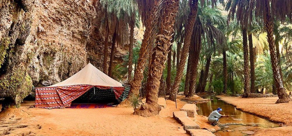 Heute fahren Sie von Chinguetti durch die graubraune Geröllwüste gen Süden. Über Ihnen ragen bizarre Felsen wie Burgen in den blauen Himmel. Ihr Ziel ist ein Naturwunder inmitten der Sahara. Eben noch nichts als staubtrockene Unendlichkeit und plötzlich ein grünes Band aus wogenden Palmen und plätschernden Thermalquellen. Willkommen in der idyllischen Oase Terjit, in der die Zeit stillzustehen scheint! Auf einem Spaziergang durch die tiefe Klamm genießen Sie das satte Grün, das Zwitschern der Vögel und die ungezählten kleinen und großen Thermal-Pools. Wer mag, erklimmt die Felsen und schaut sich die Palmen-Oase von oben an. Nach einem Minztee im Beduinenzelt geht es zur Übernachtung zurück nach Azougui. (FMA)