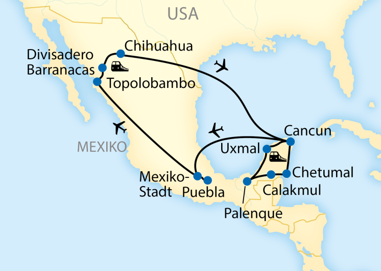 Lernen Sie Mexiko mit den berühmtesten Zügen des Landes auf außergewöhnliche Weise kennen! Mit dem Chepe Express und dem Tren Maya entdecken Sie das facettenreiche Land auf besonders komfortable und authentische Weise. In Ihrer kleinen Gruppe von höchstens 20 Gästen reisen Sie zu den bedeutendsten Kulturstätten der Maya, erleben die Tempel im üppigen Grün des Regenwalds und die Felsfestungen am Strand. Auch kulinarisch hat Mexiko einiges zu bieten: Lassen Sie sich in landestypischen Restaurants regionale Köstlichkeiten schmecken!