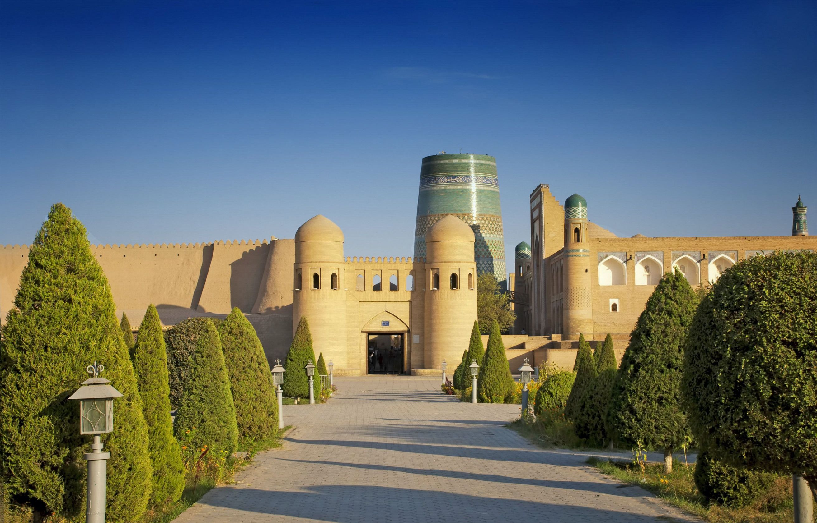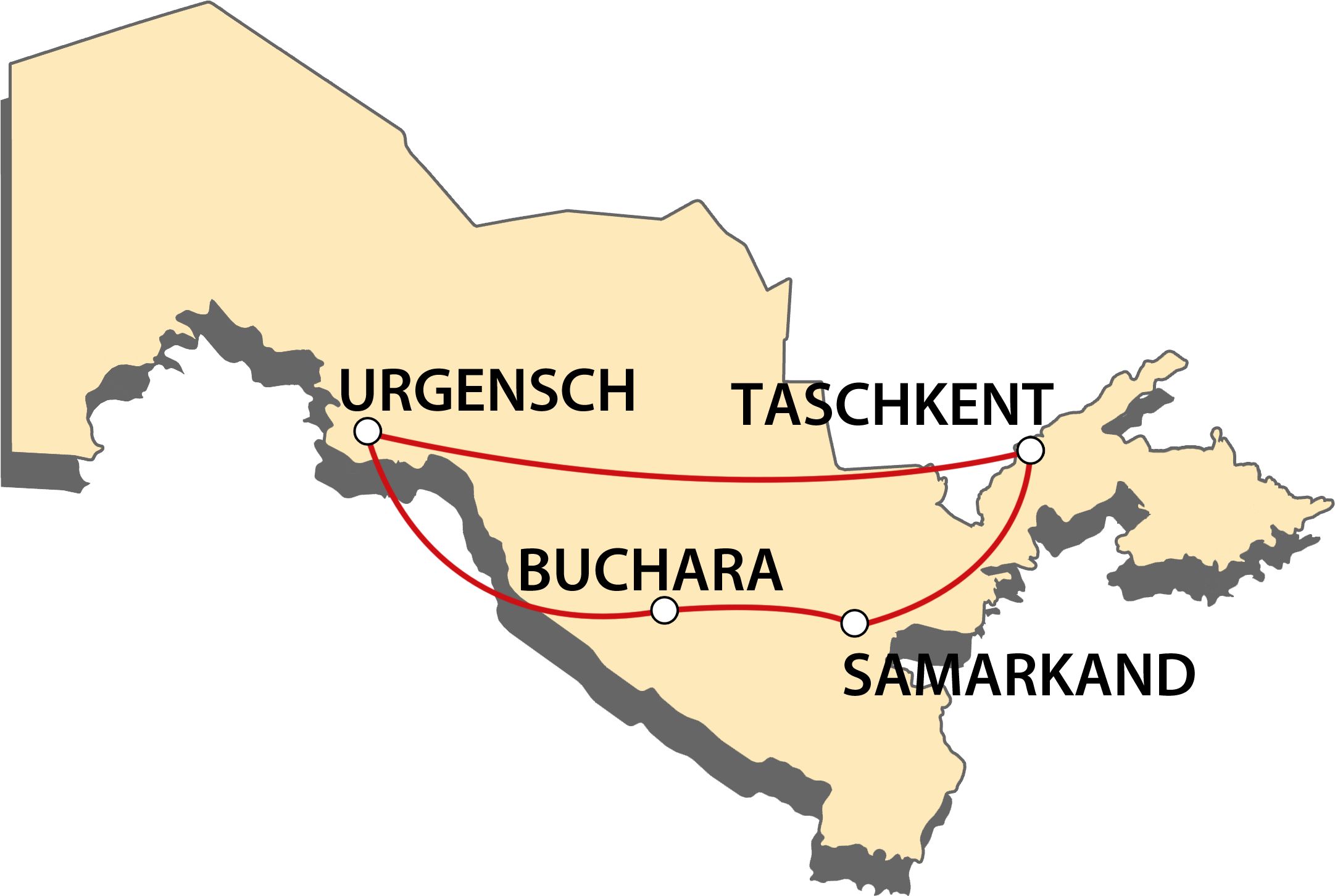 - Taschkent-Stadtrundfahrt inklusive Metro, Registan-Platz Samarkand, Gur-Emir-Mausoleum, Ensemble Schahi-Sinda, Basare, Buchara mit Ark-Zitadelle & Kaljan-Moschee, Synagoge & Familienbesuch, Fahrt durch Wüste Kizil-Kom, Zirkusfamilie Darbozschi in Chiwa, UNESCO-Weltkulturerbe Itschan-Kala
